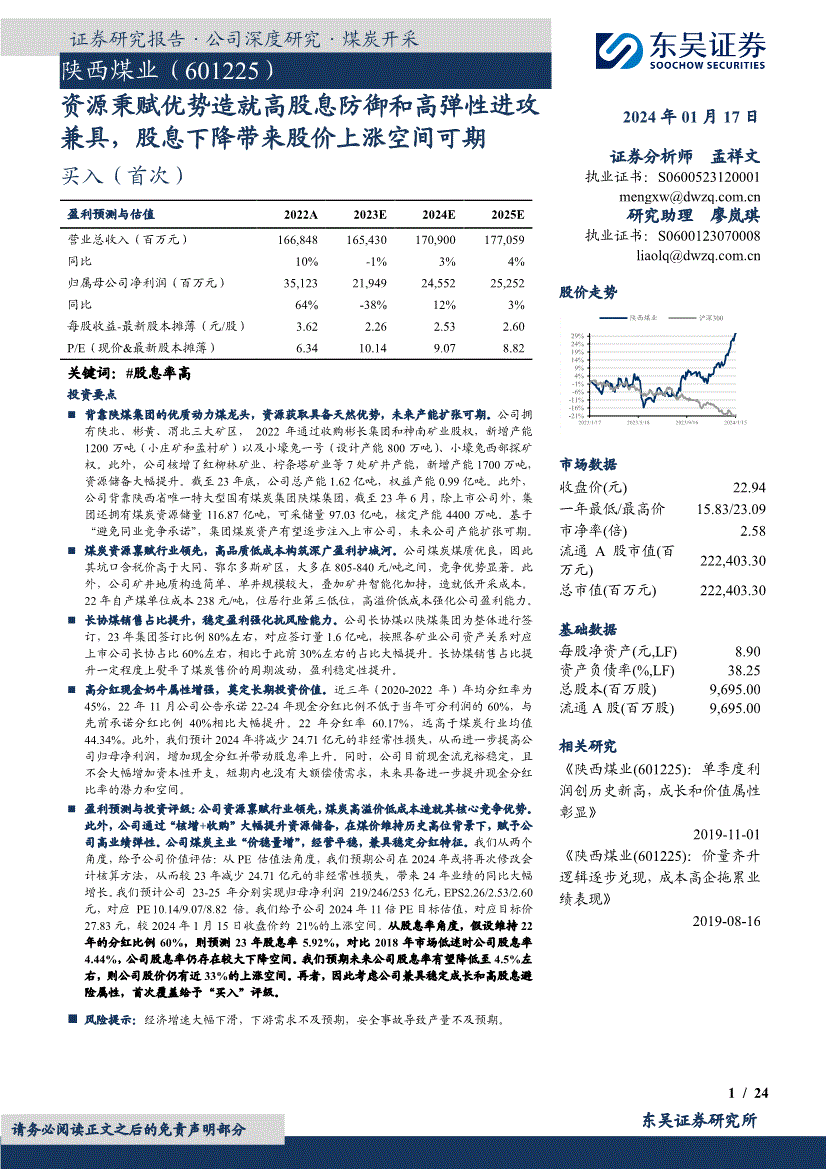 证券研究报告·公司深度研究·煤炭开采东吴证券研究所陕西煤业(601225) 资源秉赋优势造就高股息防御和高弹性进攻兼具,股息下降带来股价上涨空间可期2024年01月17日证券分析师 孟祥文执业证书:研究助理 廖岚琪执业证书:S08 .cn 股价走势市场数据 收盘价(元) 22.94 一年最低/最高价15.83/23.09 市净率(倍) 2.58 流通A股市值(百万元) 222,403.30 总市值(百万元) 222,403.30 基础数据 每股净资产(元,LF) 8.90 资产负债率(%,LF) 38.25 总股本(百万股) 9,695.00 流通A股(百万股) 9,695.00 相关研究 《陕西煤业(601225):单季度利润创历史新高,成长和价值属性彰显》 2019-11-01 《陕西煤业(601225):价量齐升逻辑逐步兑现,成本高企拖累业绩表现》 2019-08-16 买入(首次) 盈利预测与估值2022A 2023E 2024E 2025E 营业总收入(百万元) 166,848165,430170,900177,059 同比10% -1% 3% 4% 归属母公司净利润(百万元) 35,12321,94924,55225,252 同比64% -38% 12% 3% 每股收益-最新股本摊薄(元/股) 3.622.262.532.60 P/E(现价&最新股本摊薄) 6.3410.149.078.82 关键词:#股息率高 投资要点背靠陕煤集团的优质动力煤龙头,资源获取具备天然优势,未来产能扩张可期。