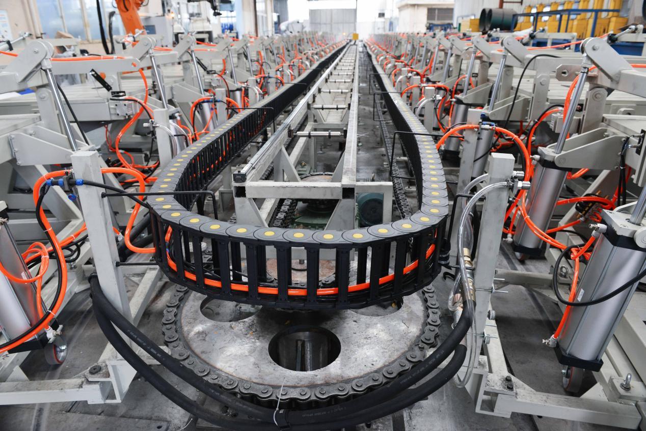 从技术层面来看,专业的生产线采用带刹车的减速电机通过变速箱带动线体整体运动,线体运行速度变频可调,这使得生产节拍能够根据实际需求进行灵活调整。而且,生产线上模具加热用模温机和模架控制箱均布放置于载模小车上,动力电采用环形电刷(滑环)引入,气源采用集中供气,通过旋转接头引入到线体上每个模架,这种设计保证了生产线的稳定运行和*工作。